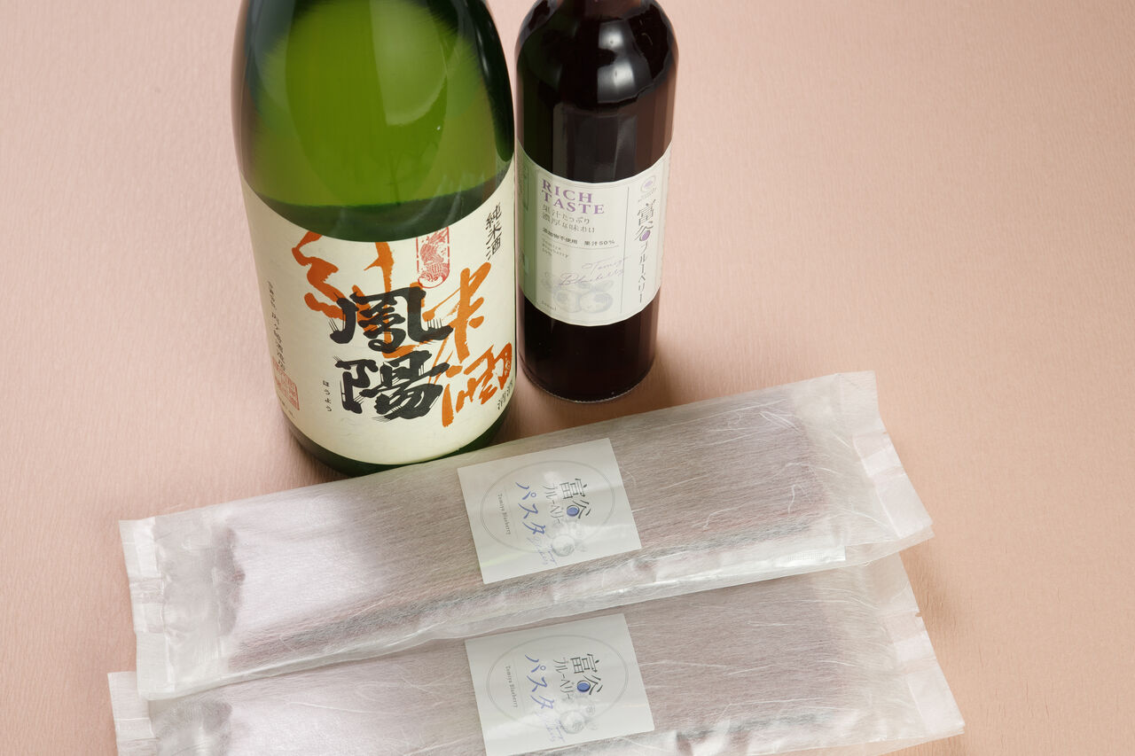 そんな富谷産ブルーベリーですが、地元で商品開発も進んでいます。富谷市と富谷市内の郵便局が、宮城学院女子大学の協力を得ながら共同開発した「富谷ブルーベリーパスタ」が1つ代表例。富谷ブルーベリージュースを生地に練り込んで作った、ブルーベリーの果実の色と香りが特徴のパスタです。そう、先ほどコースの中で登場したパスタですね!