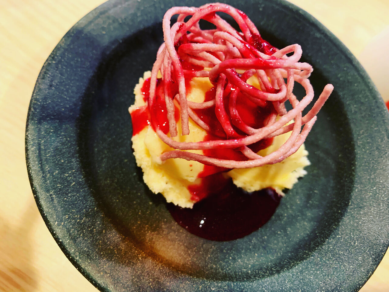 アイスとプリンを2種類も食べられる贅沢なデザートでついに〆です。アイスには香り高いブルーベリーパスタが。ブルーベリーソースをたっぷりかけていただきます。