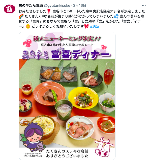 富谷市&味の牛たん喜助コラボレートメニュー「富喜(ふうき)ディナー」 ということだったのです。