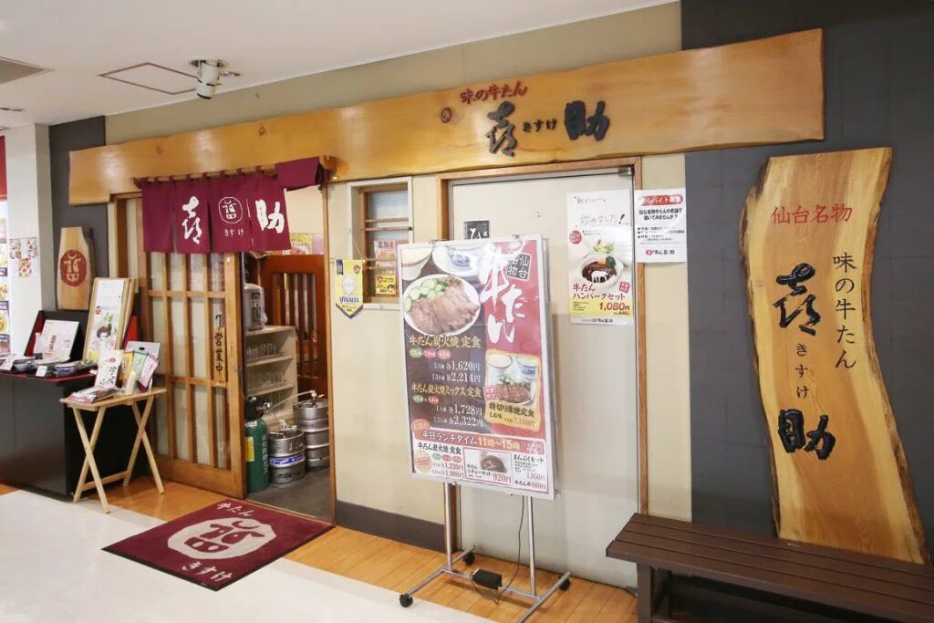 ありました!木の看板がいい感じ、こちらが味の牛たん喜助 泉中央駅店さんです。営業情報については公式ホームページ(▶︎ https://www.kisuke.co.jp/shop/izumi_chuo )で常時確認できますので、行く前に確認しておくと安心ですね。