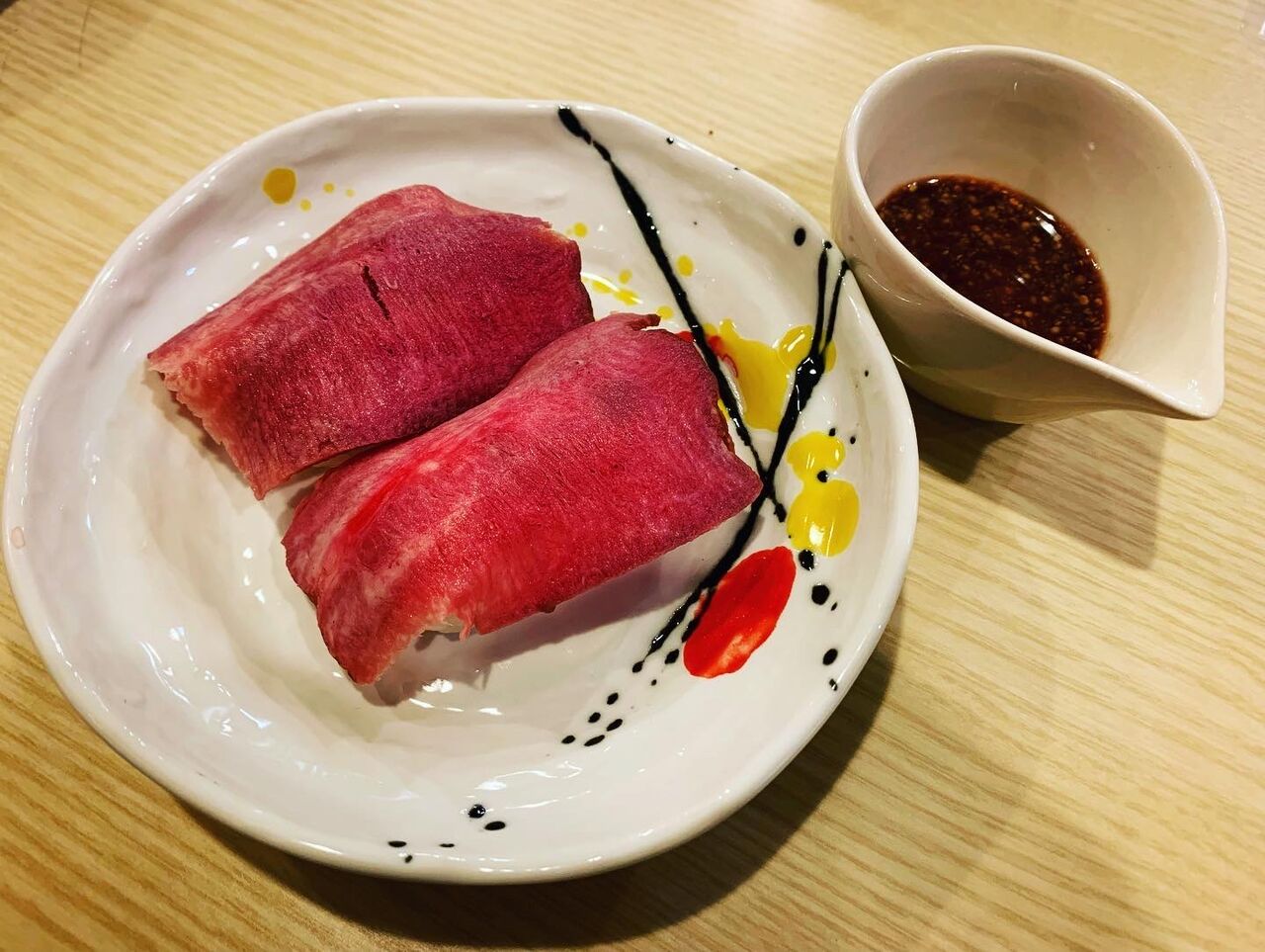 うわぁ…やってくれました味の牛たん喜助さん。牛たんの刺身なんて初めて食べましたよ…。店長が考案したブルーベリーマスタードソースをたっぷりかけて食べるのがおすすめということで、「これでもか!」というくらいたっぷりかけていただきましたが、もう言葉が出ません。美味しすぎるんです。まずはマスタードとブルーベリーが絶妙にマッチし、舌の上に「美味しい酸味」を運んできます。そしてその後は噛めば噛むほど旨味が出てきる牛たん刺の握り。ああ…幸せって、このことだな。