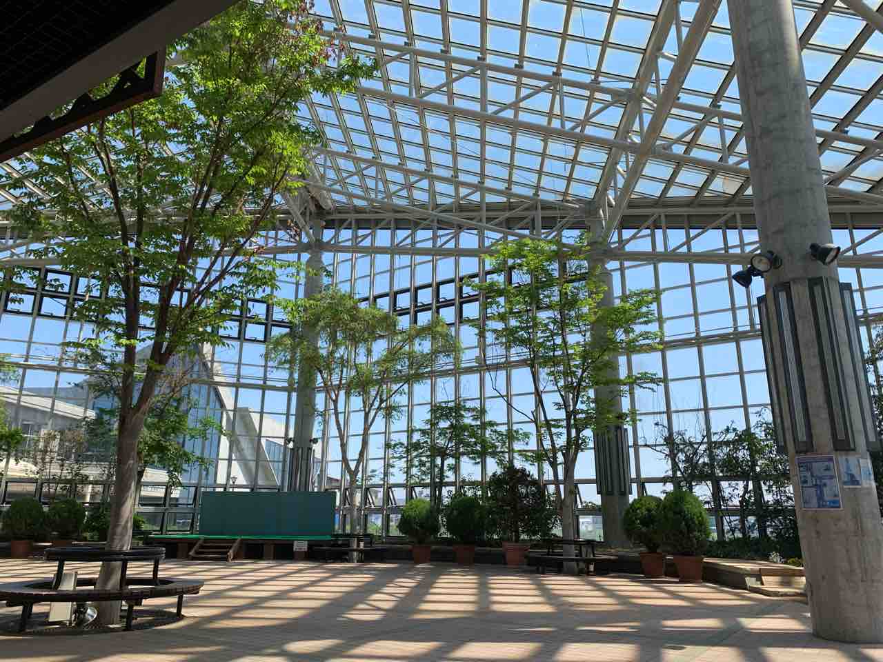 道の駅あきた港構内にはガラス張りの↓こんな感じの建物があるのですが、こちらの室内にその自動販売機はあります(下の写真は建物内から撮影した写真。分かりにくくてすみません。)